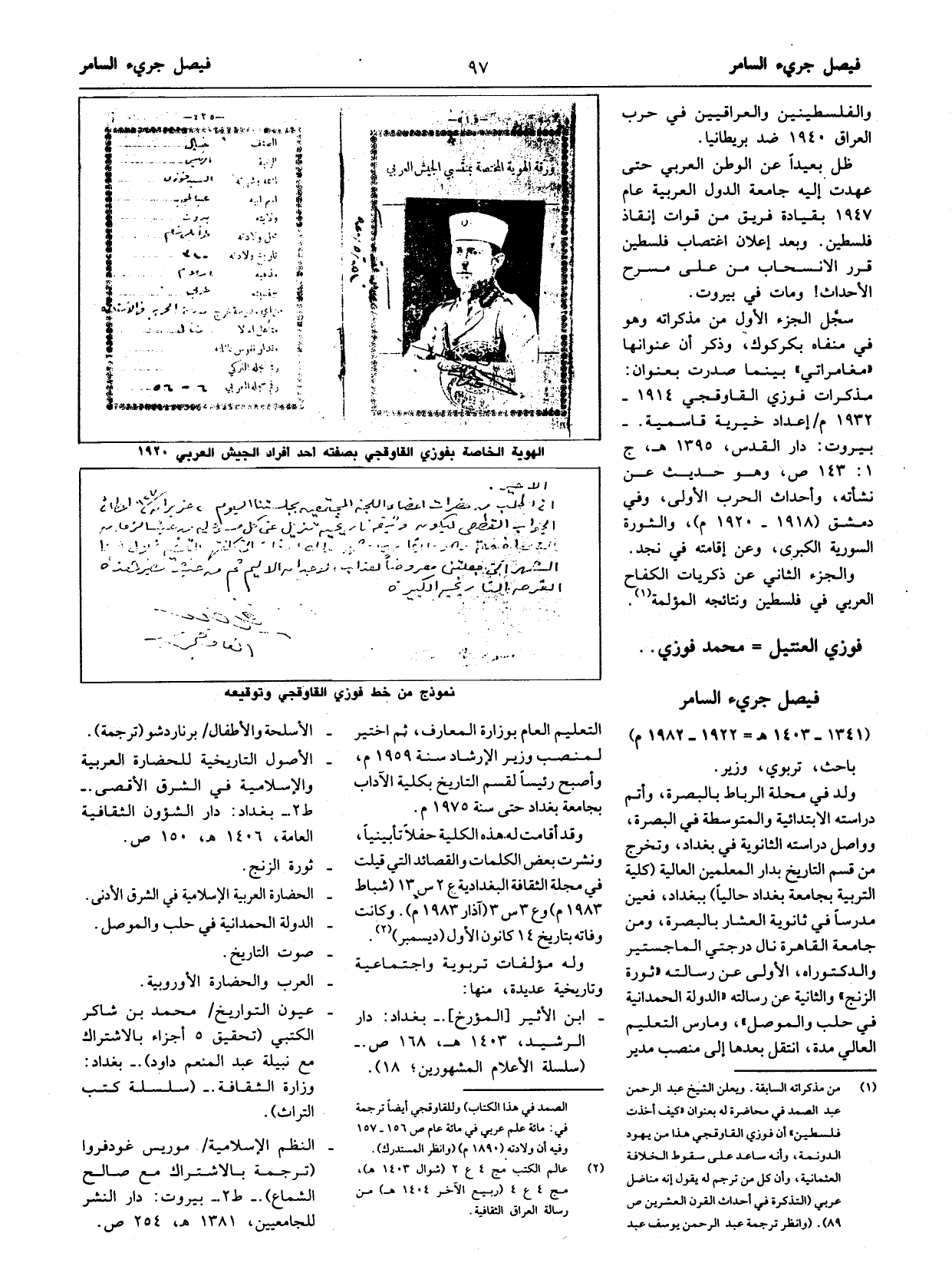 الصمد في هذا الكتاب) وللقاوقجي أيضا ترجمة في: مائة علم عربي في مائة عام ص 156 - 157 وفيه أن ولادته (1890 م) (وانظر المستدرك).