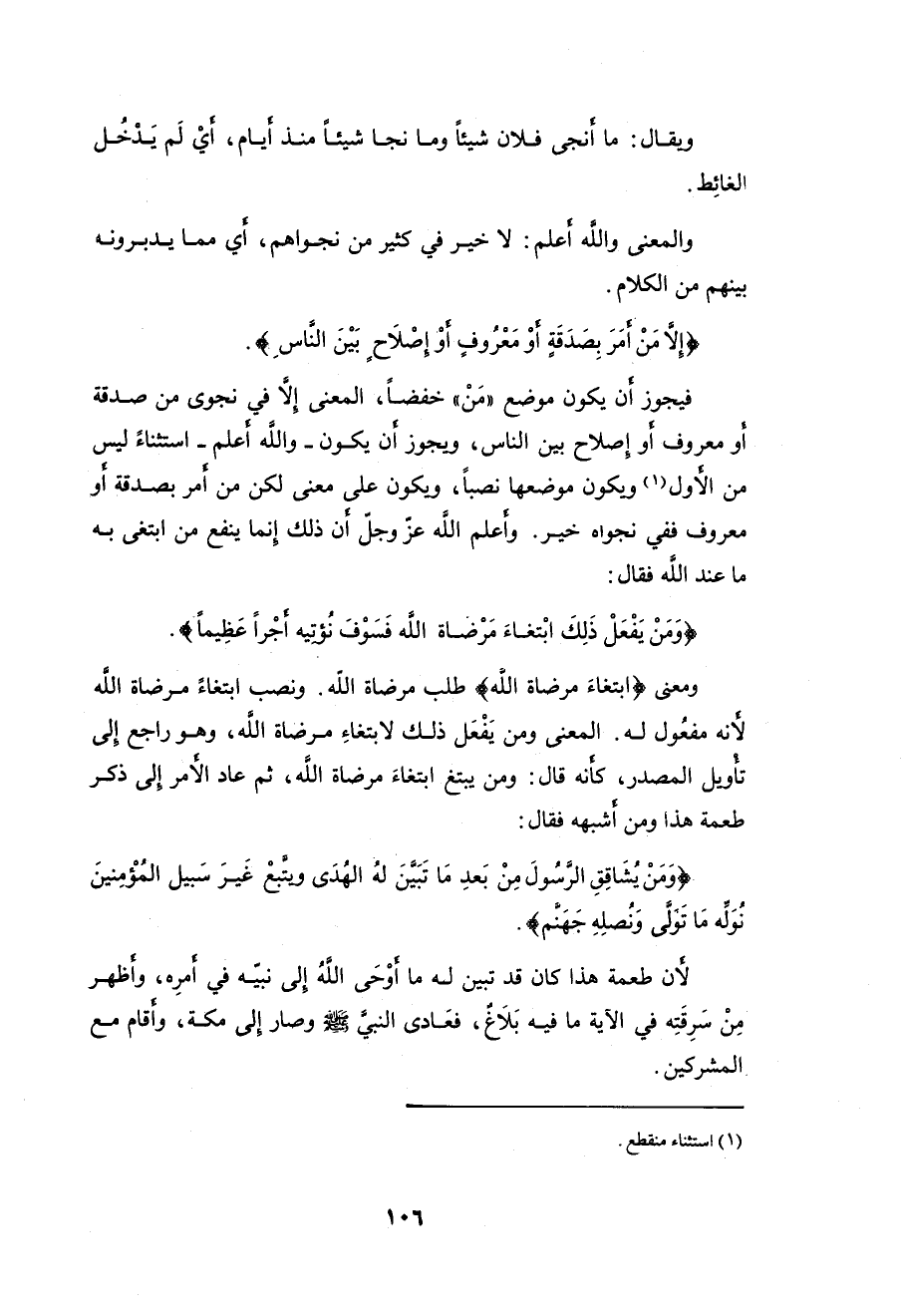 أو معروف أو إصلاح بين الناس، ويجوز أن يكون - واللَّه أعلم - استثناءً ليس من الأول ويكون موضعها نصباً، ويكون على معنى لكن من أمر بصدقة أو معروف ففي نجواه خير. وأعلم الله عزَّ وجلَّ أن ذلك إنما ينفع من ابتغى به ما عند اللَّه فقال: