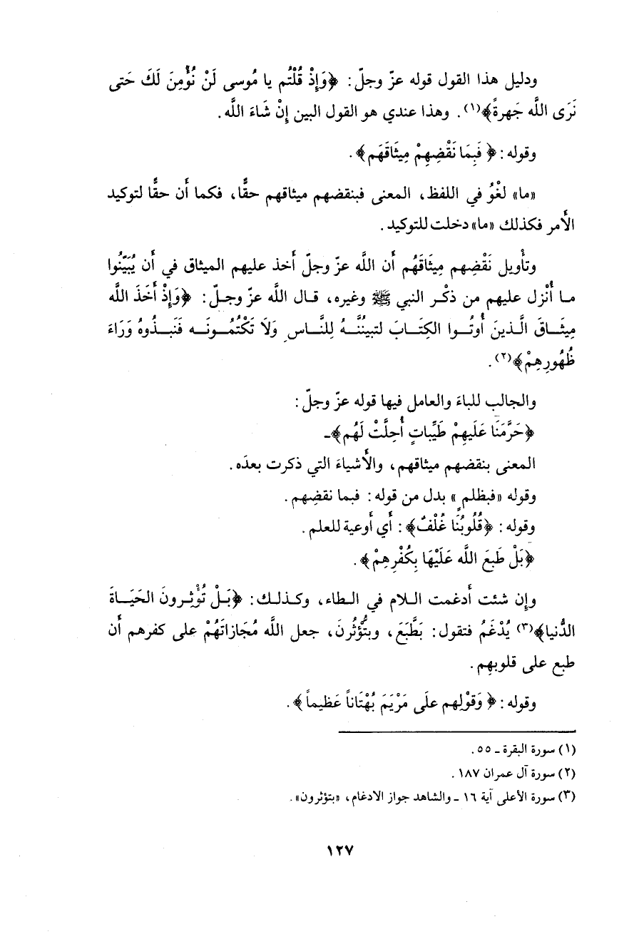 وقوله: (فَبِمَا نَقْضِهِمْ مِيثَاقَهُمْ وَكُفْرِهِمْ بِآيَاتِ اللَّهِ وَقَتْلِهِمُ الْأَنْبِيَاءَ بِغَيْرِ حَقٍّ وَقَوْلِهِمْ قُلُوبُنَا غُلْفٌ بَلْ طَبَعَ اللَّهُ عَلَيْهَا بِكُفْرِهِمْ فَلَا يُؤْمِنُونَ إِلَّا قَلِيلًا (155)