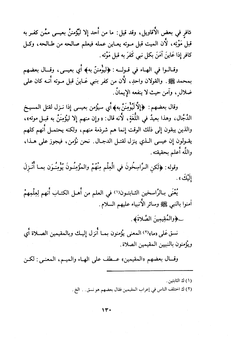 وقال بعضهم " المقيمين " عطف على الهاء والميم، المعنى: لكن