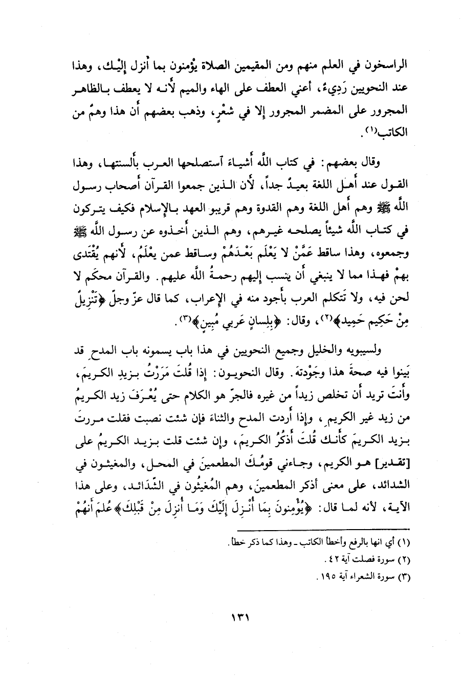 الراسخون في العلم منهم ومن المقيمين الصلاة يُؤمنون بما أنزل إليْك، وهذا
