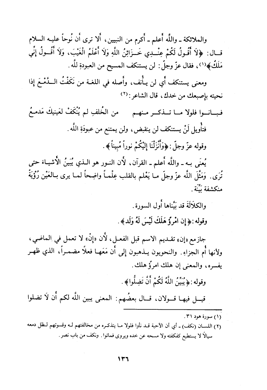قال: (وَلَا أَقُولُ لَكُمْ عِنْدِي خَزَائِنُ اللَّهِ وَلَا أَعْلَمُ الْغَيْبَ وَلَا أَقُولُ إِنِّي مَلَكٌ)، فقال عزَّ وجلَّ: (لن يستنكف المسيح) من العبودةِ للَّهِ.
