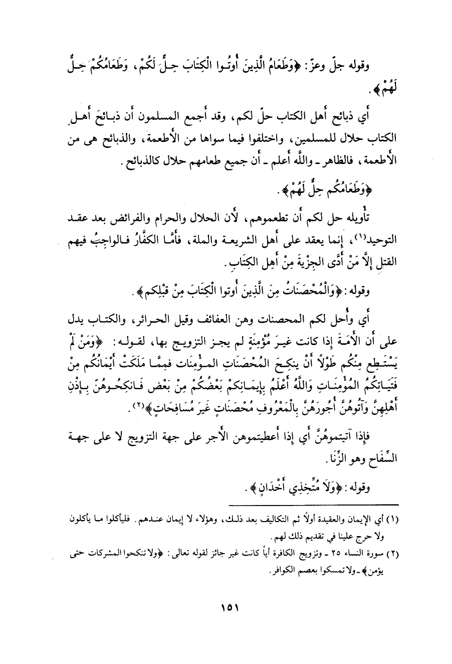 وقوله جلَّ وعز: (الْيَوْمَ أُحِلَّ لَكُمُ الطَّيِّبَاتُ وَطَعَامُ الَّذِينَ أُوتُوا الْكِتَابَ حِلٌّ لَكُمْ وَطَعَامُكُمْ حِلٌّ لَهُمْ وَالْمُحْصَنَاتُ مِنَ الْمُؤْمِنَاتِ وَالْمُحْصَنَاتُ مِنَ الَّذِينَ أُوتُوا الْكِتَابَ مِنْ قَبْلِكُمْ إِذَا آتَيْتُمُوهُنَّ أُجُورَهُنَّ مُحْصِنِينَ غَيْرَ مُسَافِحِينَ وَلَا مُتَّخِذِي أَخْدَانٍ وَمَنْ يَكْفُرْ بِالْإِيمَانِ فَقَدْ حَبِطَ عَمَلُهُ وَهُوَ فِي الْآخِرَةِ مِنَ الْخَاسِرِينَ (5)