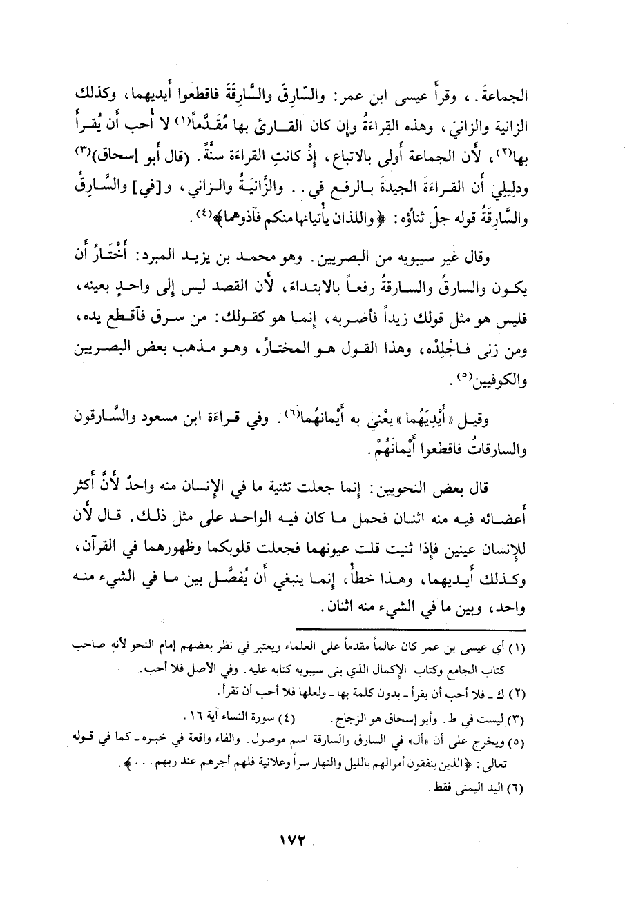وكذلك الزانيةَ والزانيَ، وهذه القِراءَةُ وإِن كان القارئ بها مقَدَّماً لا أحب أن يُقرأ بها، لأن الجماعة أولى بالاتباع، إذْ كانتِ القراءَة سنَة.