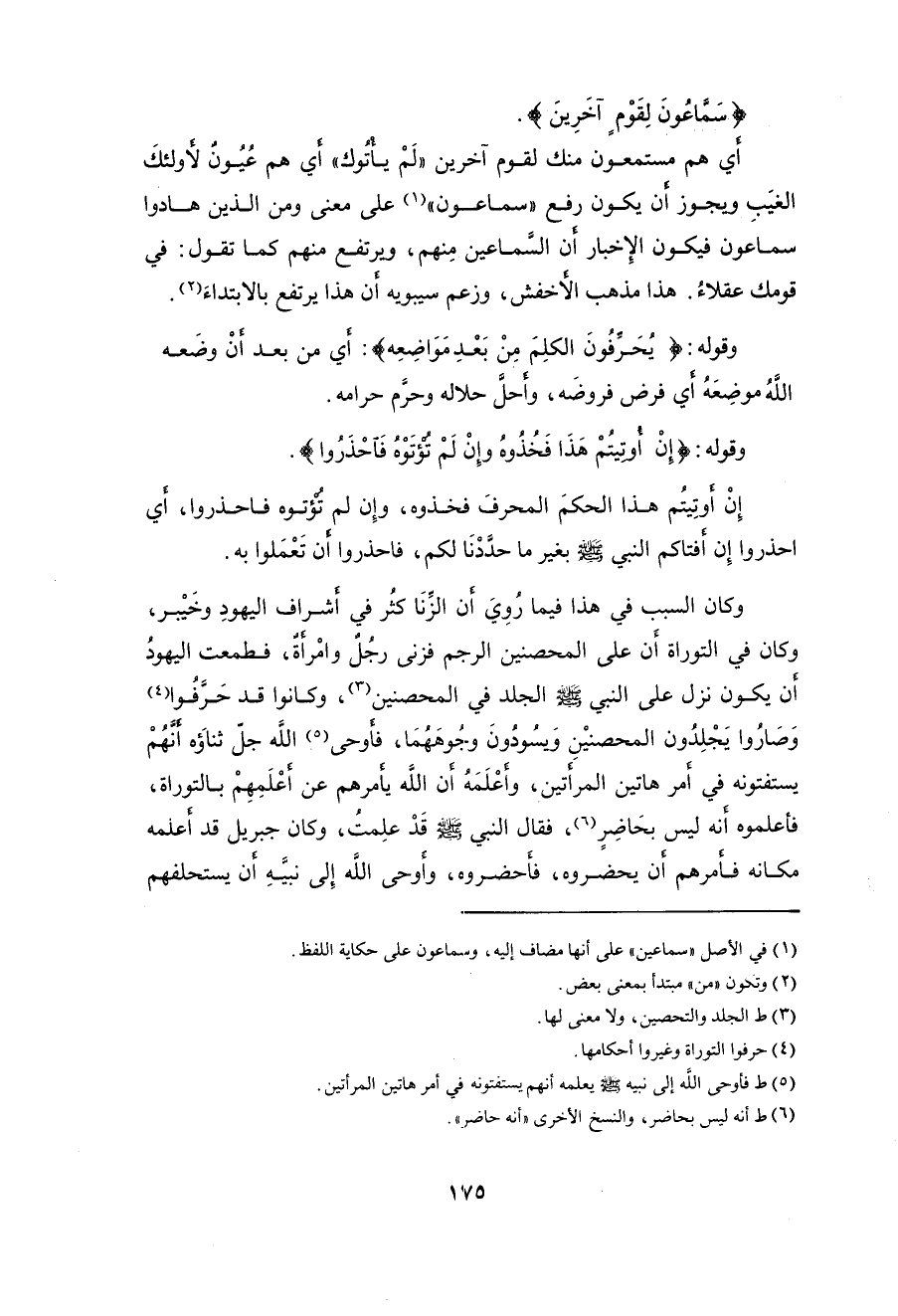 أن يكون نزل على النبي - صلى الله عليه وسلم - الجلد في المحصنين، وكانوا قد حَرَّفُوا وَصَارُوا يَجْلِدُون المحصنيْنِ وَيسُودُونَ وجُوهَهُمَا، فأوحى الله جل ثناؤه أنَّهمْ يستفتونه في أمر هاتين المراتين، وأعلَمَهُ أن اللَّه يأمرهم عن أعلَمِهِمْ بالتوراة، فأعلموه إنَّه ليس بحَاضِرٍ، فقال النبي - صلى الله عليه وسلم - قَدْ علِمتُ، وكان جبريل قد أعلمه مكانه فأمرهم أن يحضروه، فأَحضروه، وأَوحى اللَّه إِلى نبيهِ أن يستحلفهم