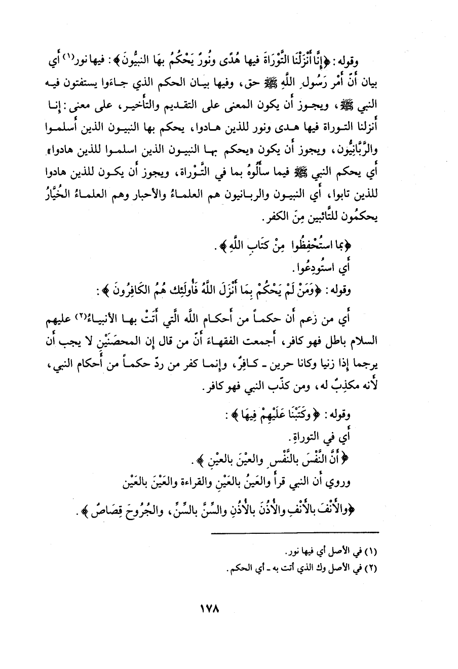 وقوله: (إِنَّا أَنْزَلْنَا التَّوْرَاةَ فِيهَا هُدًى وَنُورٌ يَحْكُمُ بِهَا النَّبِيُّونَ الَّذِينَ أَسْلَمُوا لِلَّذِينَ هَادُوا وَالرَّبَّانِيُّونَ وَالْأَحْبَارُ بِمَا اسْتُحْفِظُوا مِنْ كِتَابِ اللَّهِ وَكَانُوا عَلَيْهِ شُهَدَاءَ فَلَا تَخْشَوُا النَّاسَ وَاخْشَوْنِ وَلَا تَشْتَرُوا بِآيَاتِي ثَمَنًا قَلِيلًا وَمَنْ لَمْ يَحْكُمْ بِمَا أَنْزَلَ اللَّهُ فَأُولَئِكَ هُمُ الْكَافِرُونَ (44)