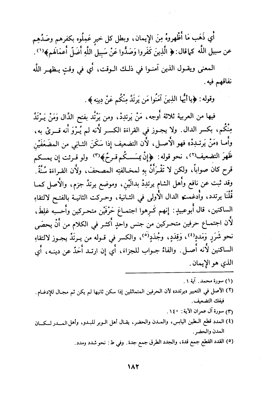 وقد ثبت عن نافع وأهل الشام يرتدِدْ بدالَيْنِ، وموضع يرتد جزم، والأصل كما قُلْنَا يرتدد، وأدغمت الدال الأولى في الثانية، وحركت الثانية بالفتح لالتقاءِ السَّاكنين، قال أبو عبيدٍ: إنهم كَرِهوا اجتماعَ حَرْفَيْن متحركين وأحسبه غلِطَ، لأن اجتماع حرفين متحركين من جنس واحد أكثر في الكلام من أنْ يحصَى نحو شَرَرٍ وَمَددٍ، وَقِدَدٍ، وخدَدٍ، والكسر في قوله من يرتَد يجوز لالتقاءِ السَّاكنين لأنه أصل.