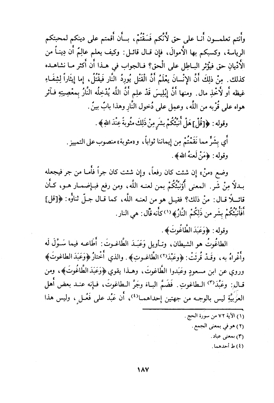 وروي عن ابن مسعودٍ وعَبَدوا الطَاغوتَ، وهذا يقوي (وَعَبَدَ الطَاغُوتَ)، ومن قال وعَبُدَ الطاغوتِ. فَضم الباءَ وجَر الطاغوت، فإِنه عند بعض أهل