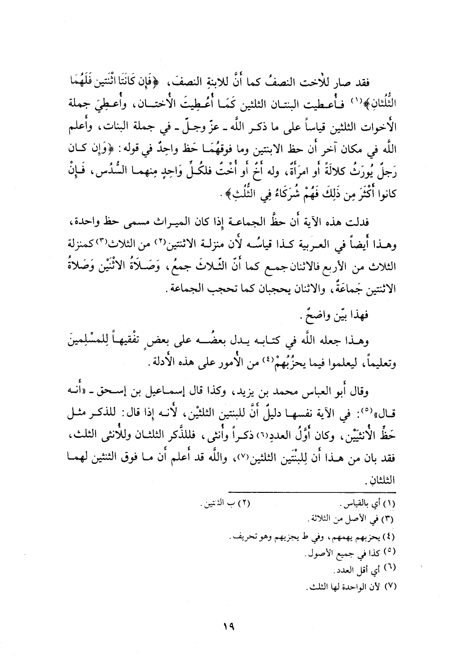 الأخوات الثلثين قياساً على ما ذكر اللَّه - عزَّ وجلَّ - في جملة البنات، وأعلم اللَّه في مكان آخر أن حظ الابنتين وما فوقهمَا حَظ واحِد في قوله: (وَإِنْ كَانَ رَجُلٌ يُورَثُ كَلَالَةً أَوِ امْرَأَةٌ وَلَهُ أَخٌ أَوْ أُخْتٌ فَلِكُلِّ وَاحِدٍ مِنْهُمَا السُّدُسُ فَإِنْ كَانُوا أَكْثَرَ مِنْ ذَلِكَ فَهُمْ شُرَكَاءُ فِي الثُّلُثِ).