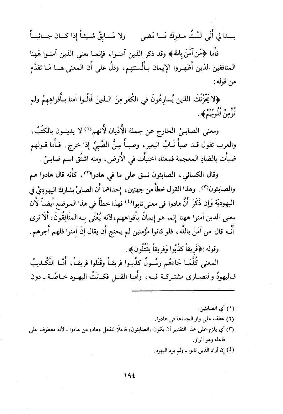 والصابئون. وهذا القول خطأ من جهتين، إِحداهما أن الصابى يشارك إليهودِي في إليهودية وَإِن ذَكَرَ أن هادوا في معنى تابوا فهذا خطأٌ في هذا الموضع أيضاً لأن معنى الذين آمنوا ههنا إِنما هو إِيمان بأفواههم، لأنه يُعْنَى بِه المنَافِقُونَ، ألا ترى اأه قال من آمَنَ باللَّه، فلو كانوا مؤمنين لم يحتج أن يقال إِنْ آمنوا فلهم أجرهم.