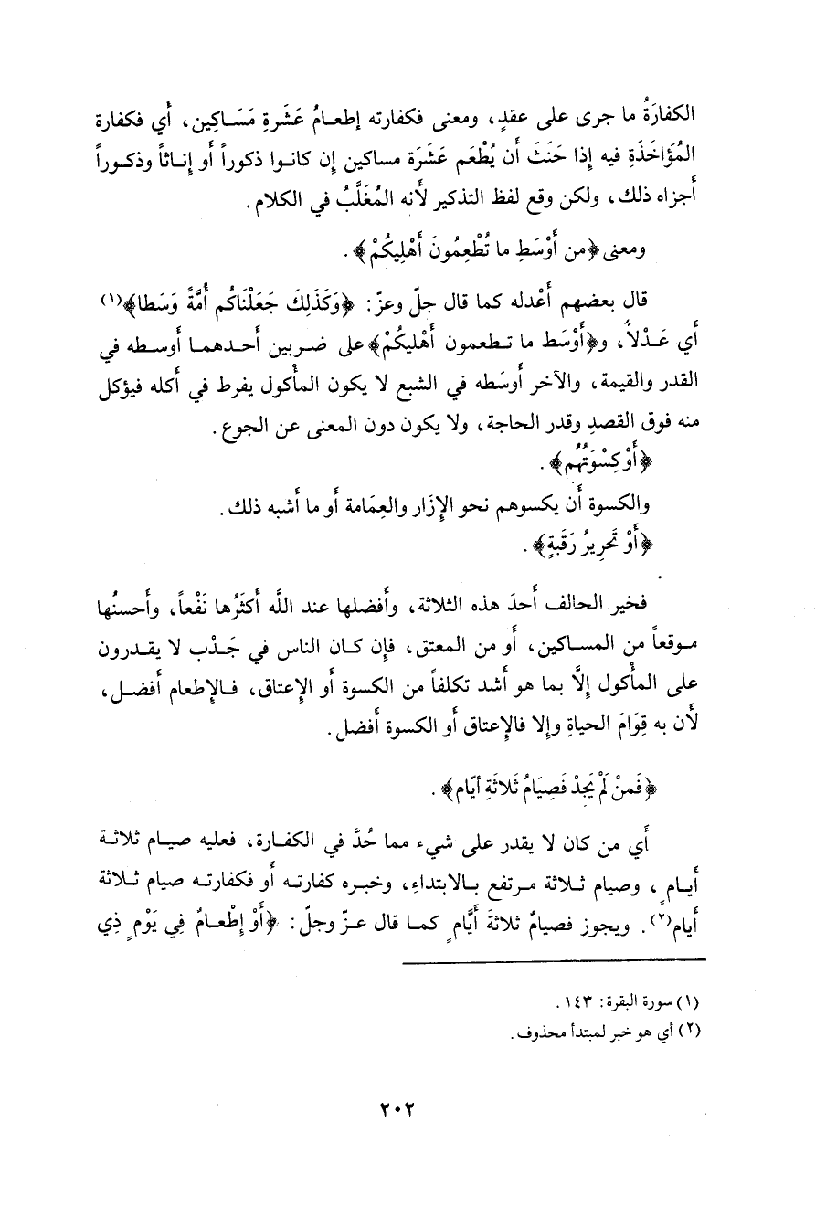 الكفارَةُ ما جرى على عقدٍ، ومعنى فكفارته إطعامُ عَشَرةِ مَسَاكين، أي فكفارة المُؤَاخَذَةِ فيه إِذا حَنَثَ أن يُطْعَم عَشَرَة مساكين إِن كانوا ذكوراً أو إِناثاً وذكوراً أجزأه ذلك، ولكن وقع لفظ التذكير لأنه المُغَلَّبُ في الكلام.