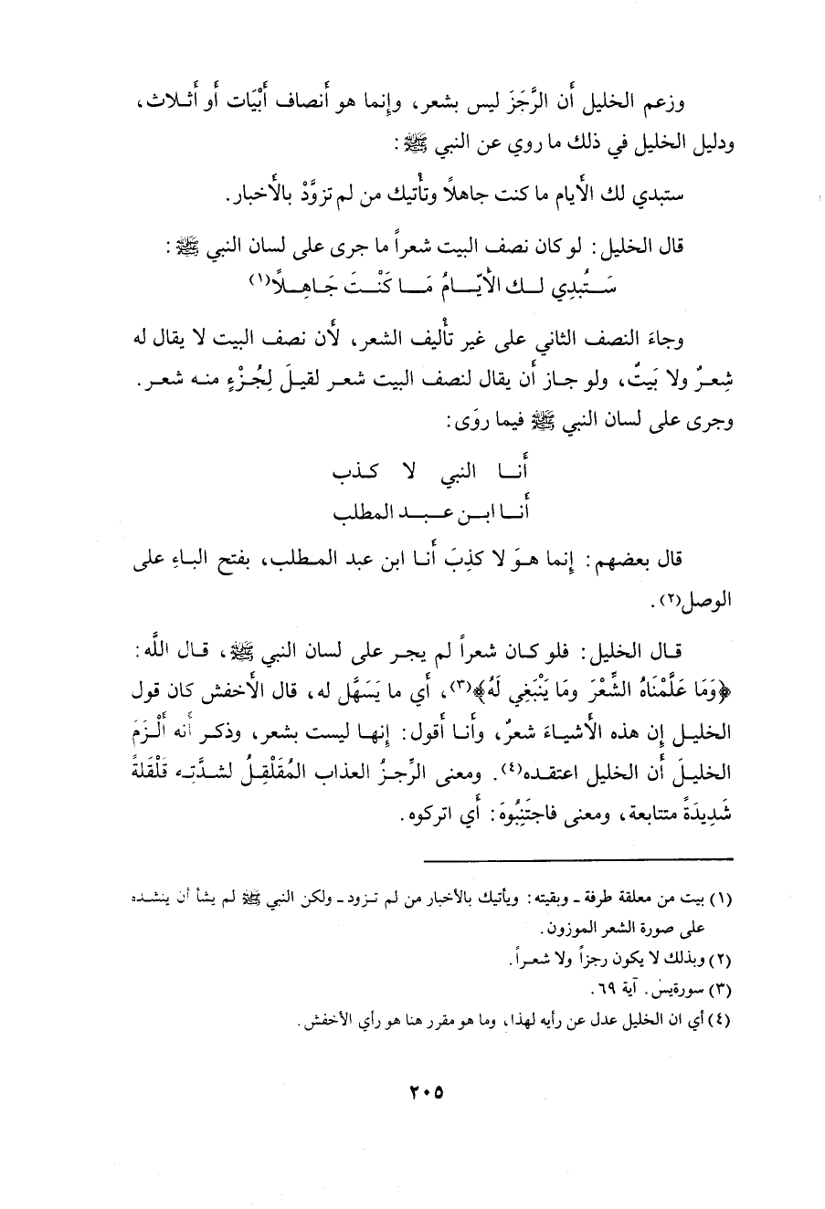 قال الخليل: فلو كان شعراً لم يجر على لسان النبي - صلى الله عليه وسلم -، قال اللَّه: (وَمَا عَلَّمْنَاهُ الشِّعْرَ وَمَا يَنْبَغِي لَهُ)، أي ما يَسَفَل له.
