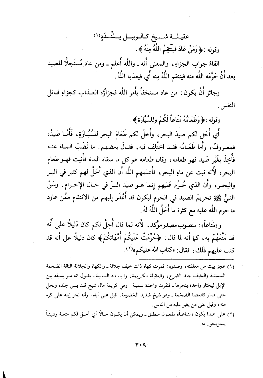 فأخِذَ بغَيْر صَيد فهو طعامه، وقال طعامه هو كل ما سقاه الماء فأنبت فهو طعام البحر، لأنه نبت عن ماءِ البحر، فأعلمهم اللَّه أن الذي أحل لهم كثير في البر والبحر، وأن الذي حُرمَ عَليهم إنما هو صيد البر في حال الإِحرام. وسَنَ النبيُّ - صلى الله عليه وسلم - تحريمَ الصيد في الحرم ليكون قد أعْذَر إِليهم من الانتقام ممن عاود ما حرم اللَّه عليه مع كثرة ما أحل اللَّهُ لَهُ.