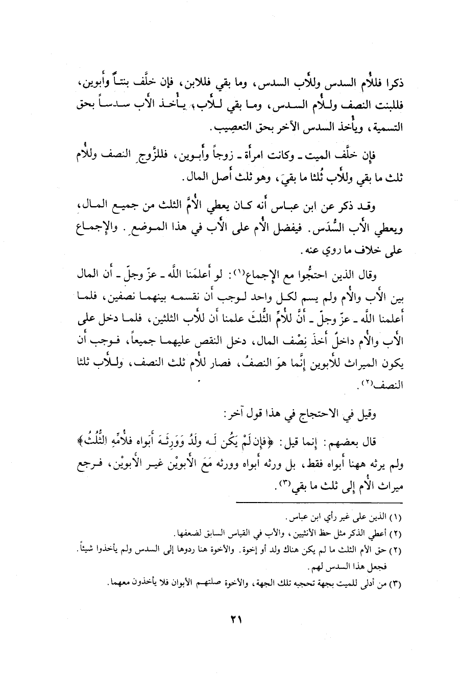 أعلمنا اللَّه - عزَّ وجلَّ - أنَّ للأم الثُلثَ علمنا أَن للأب الثلثين، فلما دخل على الأب والأم داخل أخذَ نِصْف المال، دخل النقص عليهما جميعاً، فوجب أن يكون الميراث للأبوين إِنَّما هوَ النص، فصار للأم ثلث النصف، وللأب ثلثا النصف. .