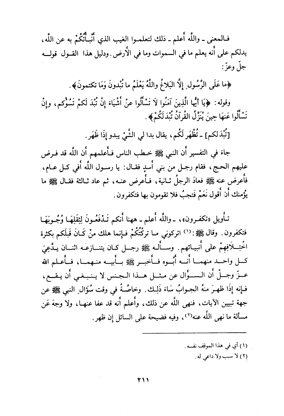 وقوله: (يَا أَيُّهَا الَّذِينَ آمَنُوا لَا تَسْأَلُوا عَنْ أَشْيَاءَ إِنْ تُبْدَ لَكُمْ تَسُؤْكُمْ وَإِنْ تَسْأَلُوا عَنْهَا حِينَ يُنَزَّلُ الْقُرْآنُ تُبْدَ لَكُمْ عَفَا اللَّهُ عَنْهَا وَاللَّهُ غَفُورٌ حَلِيمٌ (101)
