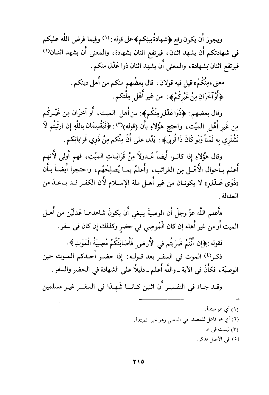 فأَعلم اللَّه عزَّ وجلَّ أن الوصيةَ ينبغي أن يكونَ شاهدها عَدلَيْن من أهل