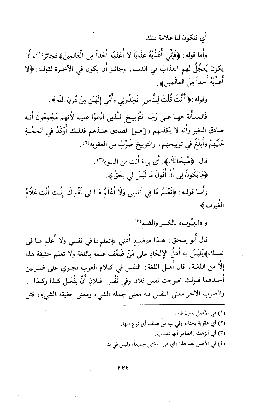 قال أبو إسحاق: هذا موضع أعني (تَعْلَمُ مَا فِي نَفْسِي وَلَا أَعْلَمُ مَا فِي نَفْسِكَ) يُلَبِّسُ به أهلُ الِإلحَادِ على مَنْ ضَعُف علمه باللغة ولا تعلم حقيقة هذا