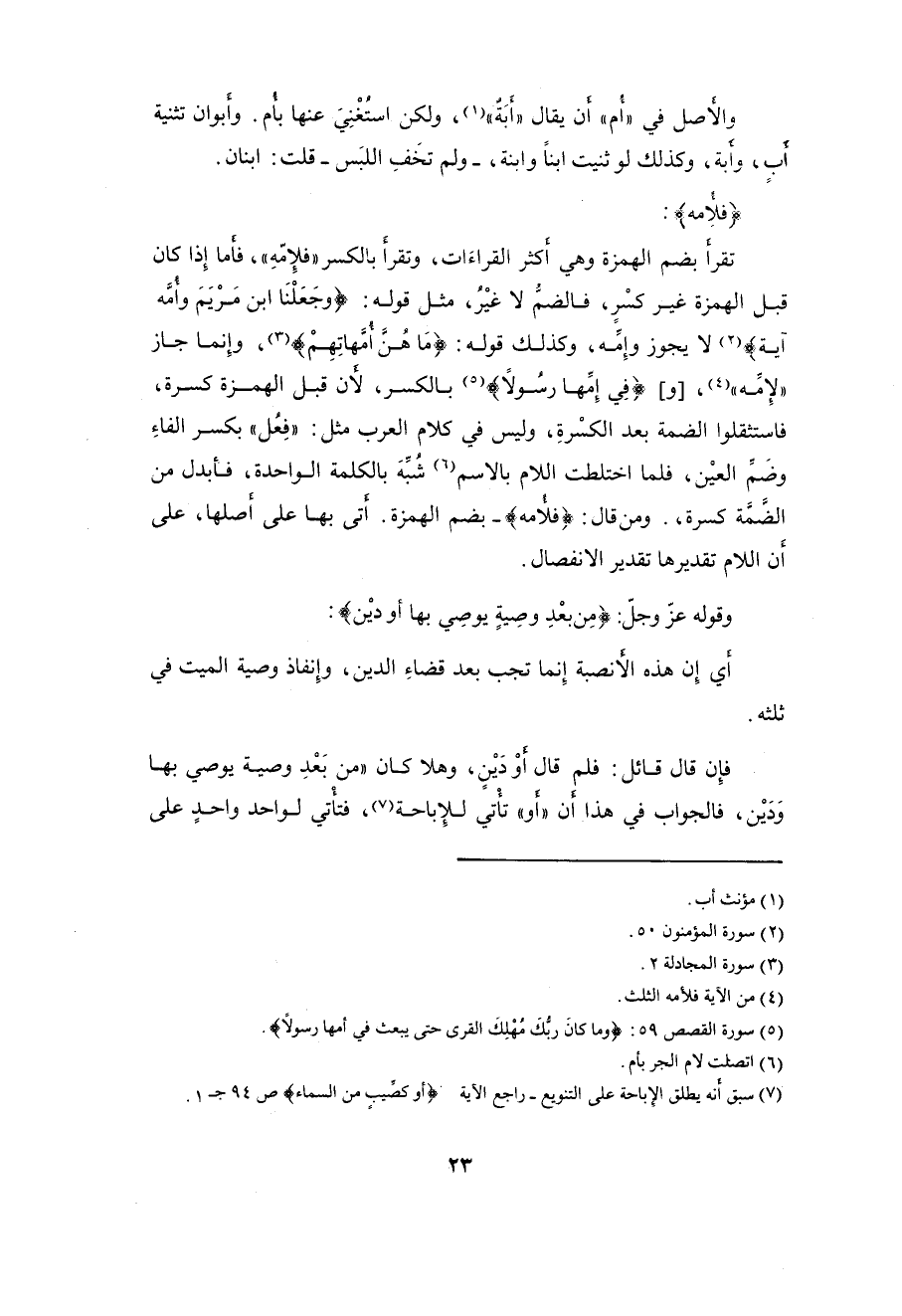 (وَجَعَلْنَا ابْنَ مَرْيَمَ وَأُمَّهُ آيَةً) لا يجوز وإِمَّه، وكذلك قوله: (مَا هُنَّ أُمَّهَاتِهِمْ)، وإِنما جاز " لِإمِّه " و (فِي أُمِّهَا رَسُولًا) بالكسر، لأن قبل الهمزة كسرة.