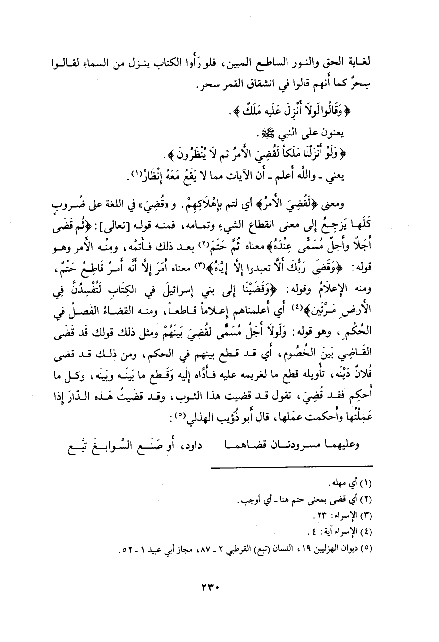 ومنه الإعلَامُ وقوله: (وَقَضَيْنَا إِلَى بَنِي إِسْرَائِيلَ فِي الْكِتَابِ لَتُفْسِدُنَّ فِي الْأَرْضِ مَرَّتَيْنِ) أي أعلمناهم إِعلاماً قاطعاً، ومنه القضاءُ الفَصلُ في