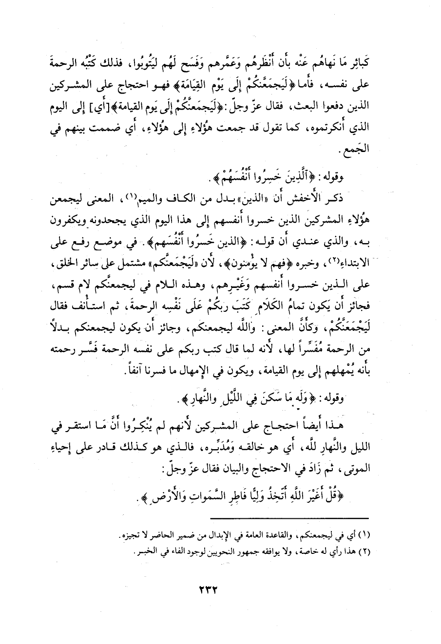 المعنى ليجمعن هؤُلاءِ المشركين الذين خسروا أنفسهم إِلى هذا اليوم الذي يجحدونه ويكفرون به، والذي عندي أن قوله: (الذين خَسرُوا انفُسَهم).
