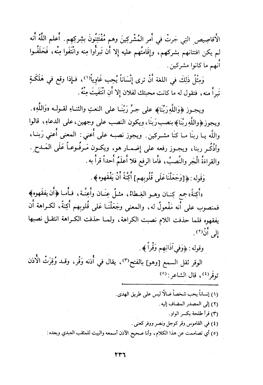فأمَّا (أَنْ يَفْقَهُوهُ) فمنصوب على أنه مَفْعولٌ له، والمعنى وَجَعَلْنَا عَلَى قُلُوبِهِمْ أَكِنَّةً، لكراهة أن يفقهوه فلما حذفت اللام نصبت الكراهة، ولما حذفت الكراهة انتقل نصبها إِلى أنْ.