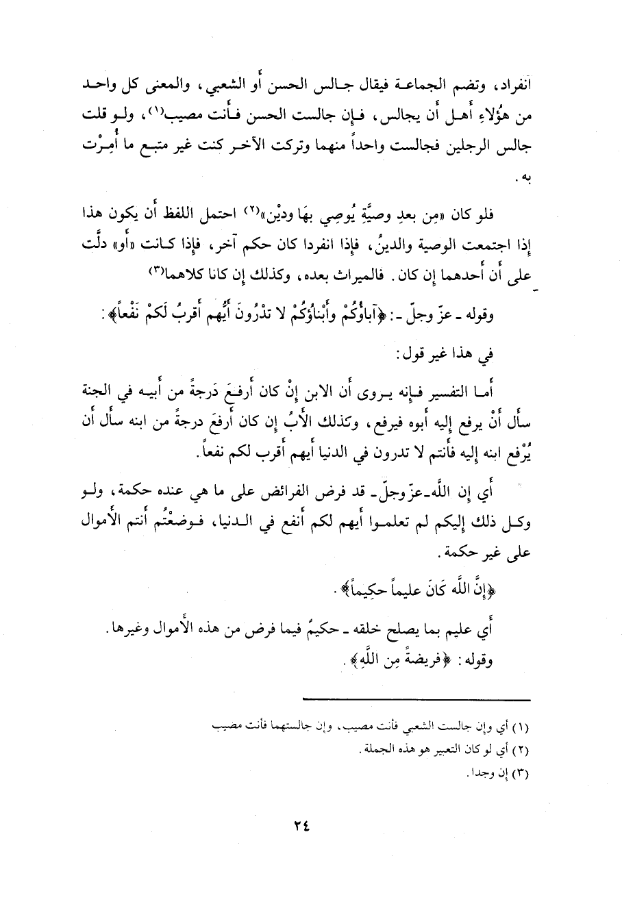 احتمل اللفظ أن يكون هذا إِذا اجتمعت الوصية والدينُ، فإِذا انفردا كان حكم آخر، فإِذا كانت " أو " دلَّت على أن أحدهما إِن كان فالميراث بعده، وكذلك إِن كانا كلاهما