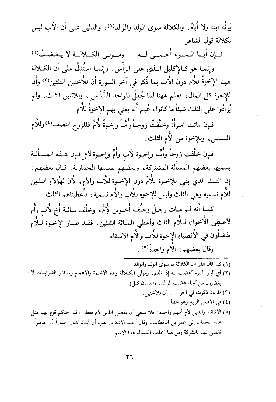 يَرثُه ابنَه ولا أبَاه. والكلالة سوى الولَدِ والوَالِدِ، والدليل على أن الأب ليس بكلالة