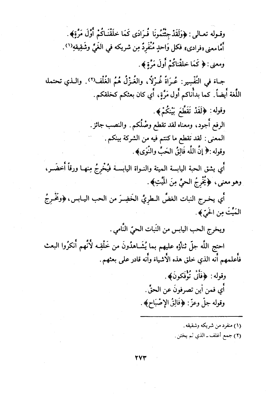 وقوله: (إِنَّ اللَّهَ فَالِقُ الْحَبِّ وَالنَّوَى يُخْرِجُ الْحَيَّ مِنَ الْمَيِّتِ وَمُخْرِجُ الْمَيِّتِ مِنَ الْحَيِّ ذَلِكُمُ اللَّهُ فَأَنَّى تُؤْفَكُونَ (95)