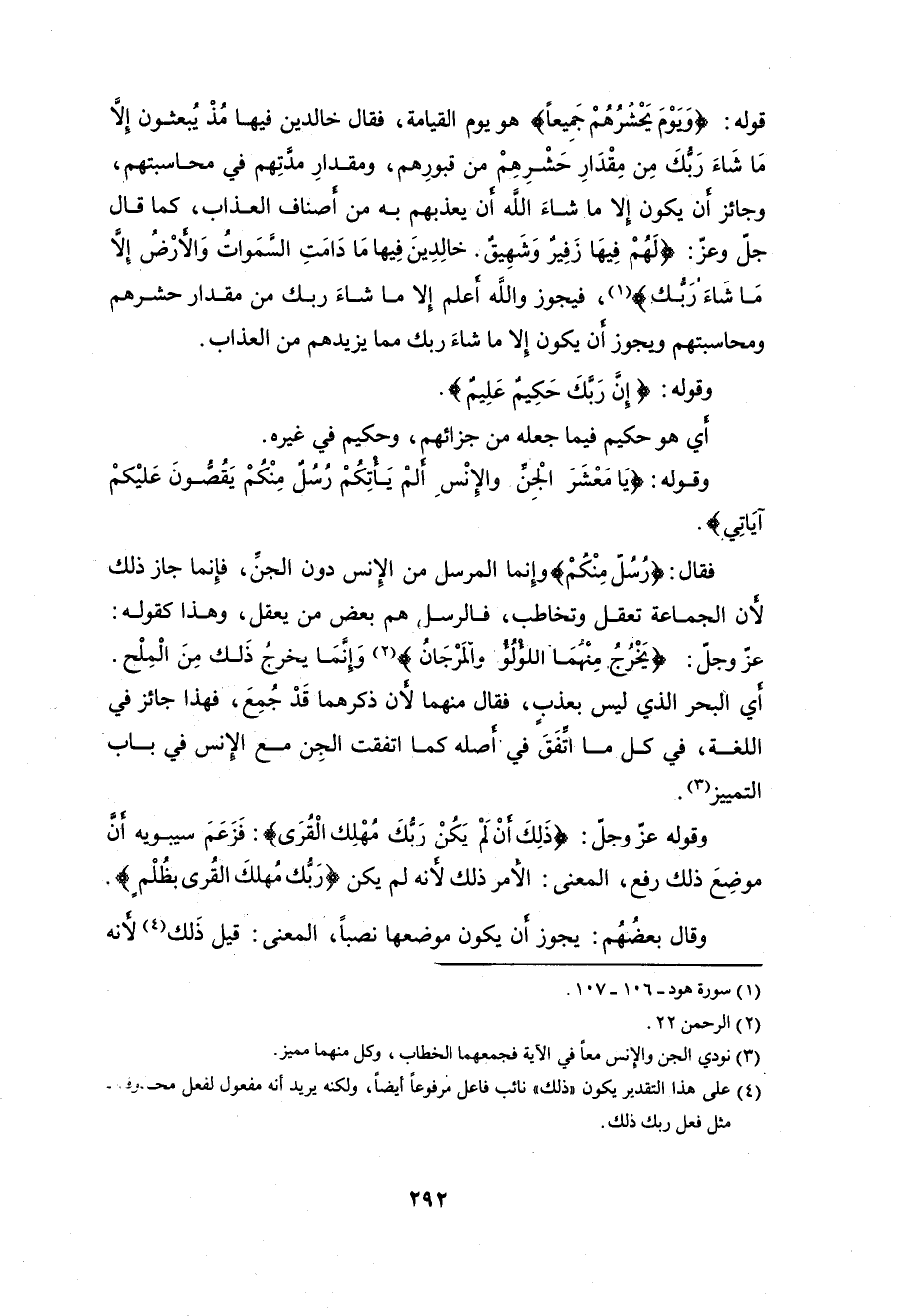 قوله: (وًيوْمَ يَحْشَرُهُمْ جَمِيعاً) هو يوم القيامة، فقال خالدين فيها مُذ يُبعثون إِلَّا مَا شَاءَ رَبُّكَ مِن مِقْدَارِ حَشْرِهِمْ من قبورِهم، ومقدارِ مدَّتِهم في محاسبتهم، وجائز أن يكون إلا ما شاءَ الله أن يعذبهم به من أصناف العذاب، كما قال