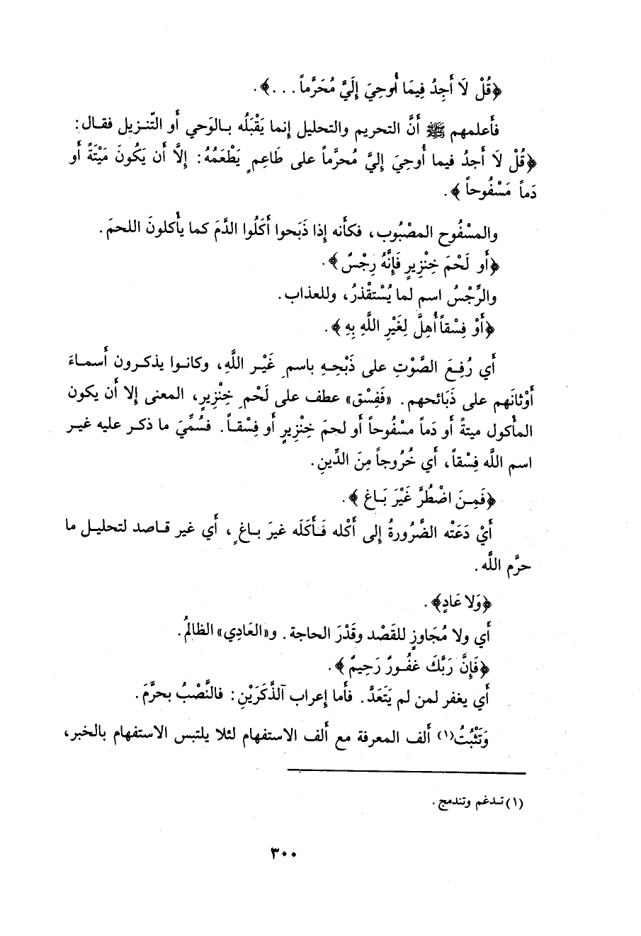 (قُلْ لَا أَجِدُ فِي مَا أُوحِيَ إِلَيَّ مُحَرَّمًا عَلَى طَاعِمٍ يَطْعَمُهُ إِلَّا أَنْ يَكُونَ مَيْتَةً أَوْ دَمًا مَسْفُوحًا أَوْ لَحْمَ خِنْزِيرٍ فَإِنَّهُ رِجْسٌ أَوْ فِسْقًا أُهِلَّ لِغَيْرِ اللَّهِ بِهِ فَمَنِ اضْطُرَّ غَيْرَ بَاغٍ وَلَا عَادٍ فَإِنَّ رَبَّكَ غَفُورٌ رَحِيمٌ (145)