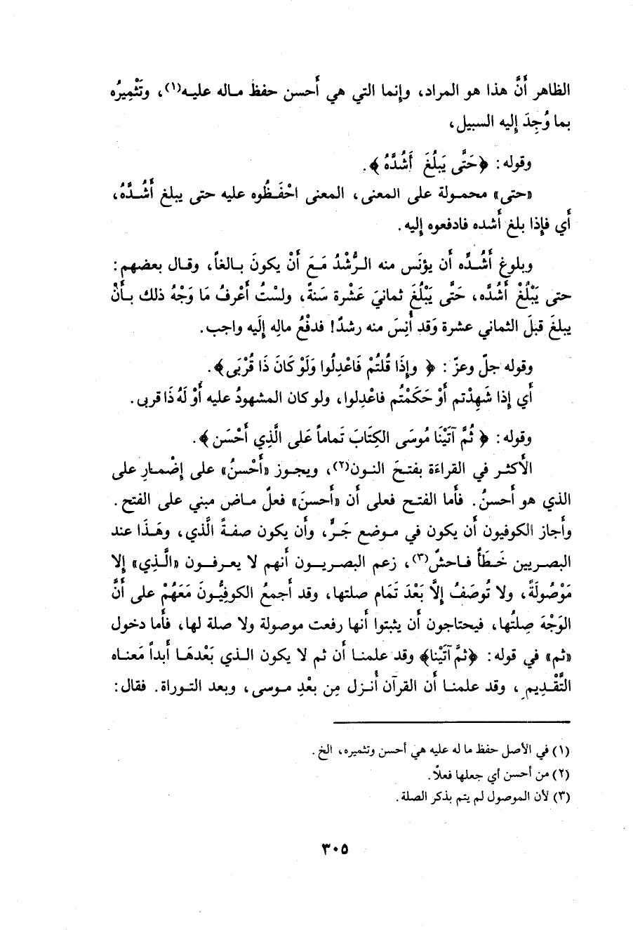 موْصُولَة، ولا تُوصَفُ إلا بَعْدَ تَمَام صلتها، وقد أجمع الكوفِيونَ مَعَهُمْ على أن الوَجْهَ صِلتُها، فيحتاجون أن يثبتوا أنها رفعت موصولة ولا صلة لها، فأمَّا دخول " ثم " في قوله: (ثُمَّ آتَيْنَا) وقد علمنا أن (ثُمَّ) لا يكون الذي بَعْدهَا أبداً مَعناه التقْدِيم أِ، وقد علمنا أن القرآن أنزل مِن بعْدِ موسى، وبعد التوراة.