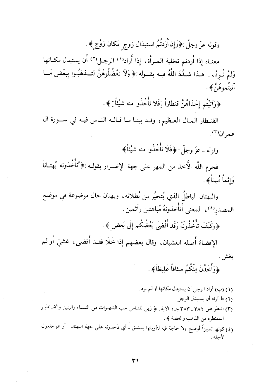 وقوله عزَّ وجلَّ: (وَإِنْ أَرَدْتُمُ اسْتِبْدَالَ زَوْجٍ مَكَانَ زَوْجٍ وَآتَيْتُمْ إِحْدَاهُنَّ قِنْطَارًا فَلَا تَأْخُذُوا مِنْهُ شَيْئًا أَتَأْخُذُونَهُ بُهْتَانًا وَإِثْمًا مُبِينًا (20)