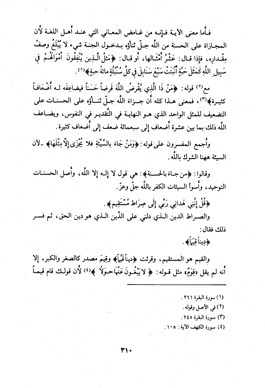 مع قوله: (مَنْ ذَا الَّذِي يُقْرِضُ اللَّهَ قَرْضًا حَسَنًا فَيُضَاعِفَهُ لَهُ أَضْعَافًا كَثِيرَةً)، فمعنى هذا كله أن جزاءَ اللَّه جلَّ ثناؤُه على الحسنات على التضعيف للمثل الواحد الذي هو النهاية في التقدير في النفوس، ويضاعف