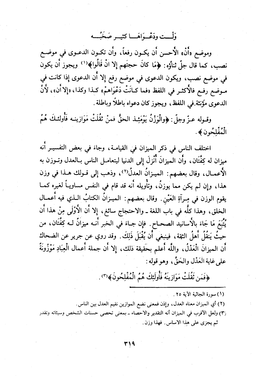 الخلق، وهذا كله في باب اللغة - والاحتجاج سائغ، إِلا أن الأوْلَى مِنْ هذا أن يُتبَعَ مَا جَاءَ بالأسانيد الصحاح. فإن جاءَ في الخبر أنه ميزان له كِفَّتَان، من حيث يَنقُلُ أهلُ الثقة، فينبغي أن يُقْبَلَ ذَلِكَ.
