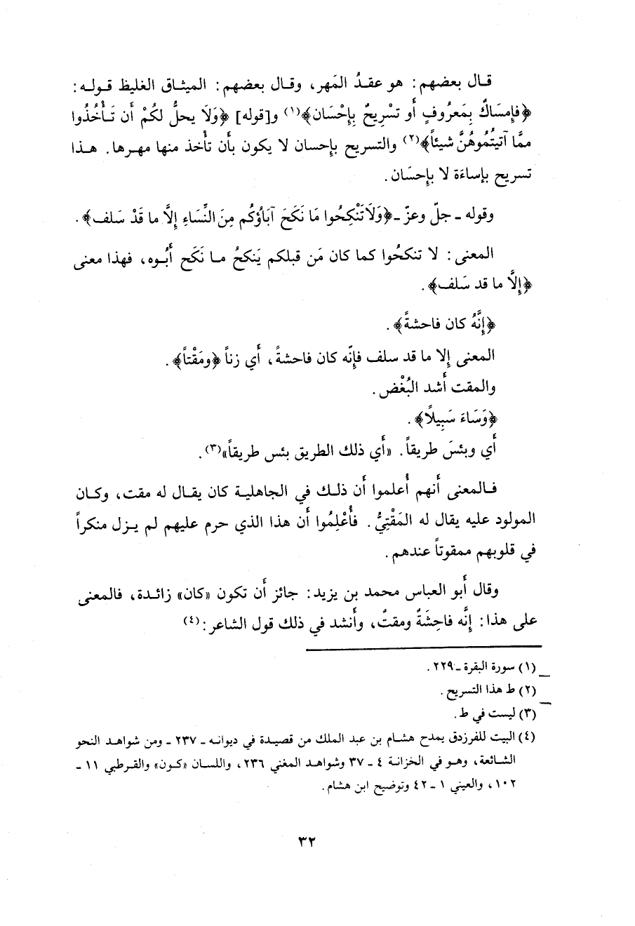 وقوله - جلَّ وعزَّ - (وَلَا تَنْكِحُوا مَا نَكَحَ آبَاؤُكُمْ مِنَ النِّسَاءِ إِلَّا مَا قَدْ سَلَفَ إِنَّهُ كَانَ فَاحِشَةً وَمَقْتًا وَسَاءَ سَبِيلًا (22)