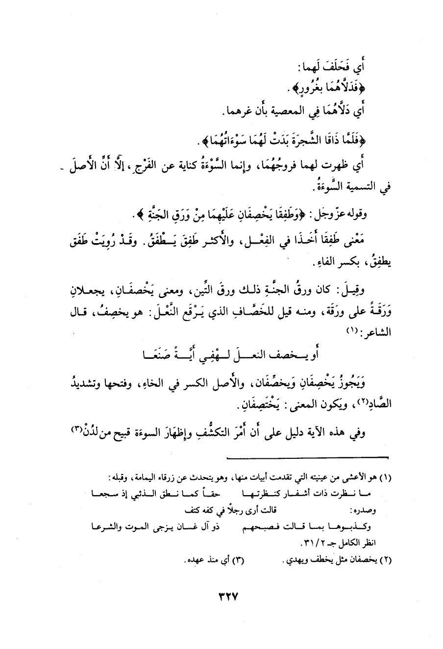 (فَدَلَّاهُمَا بِغُرُورٍ فَلَمَّا ذَاقَا الشَّجَرَةَ بَدَتْ لَهُمَا سَوْءَاتُهُمَا وَطَفِقَا يَخْصِفَانِ عَلَيْهِمَا مِنْ وَرَقِ الْجَنَّةِ وَنَادَاهُمَا رَبُّهُمَا أَلَمْ أَنْهَكُمَا عَنْ تِلْكُمَا الشَّجَرَةِ وَأَقُلْ لَكُمَا إِنَّ الشَّيْطَانَ لَكُمَا عَدُوٌّ مُبِينٌ (22)