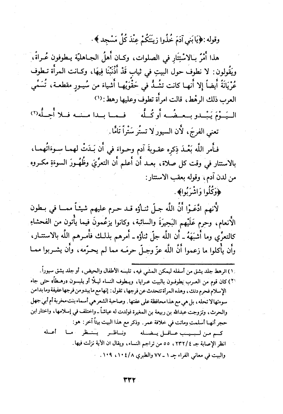 وَيقُولون: لا نطوف حول البيتِ في ثياب قَدْ أذْنَبْنَا فِيهَا، وكانت المرأة تطوف عُرْيَانَة أيضاً إلا أنها كانت تشُدُّ في حَقْويها أشياءَ من سُيورٍ مقطعة، تُسَمِّي العرب ذلك الرهْط، قالت امرأة تطوف وعليها رهط: