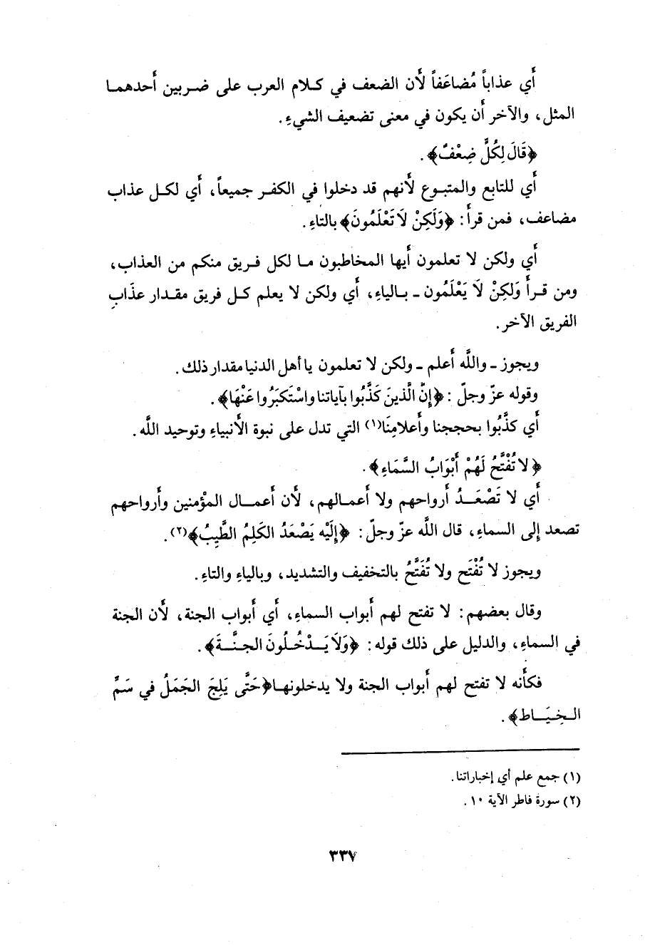 وقوله عزَّ وجلَّ: (إِنَّ الَّذِينَ كَذَّبُوا بِآيَاتِنَا وَاسْتَكْبَرُوا عَنْهَا لَا تُفَتَّحُ لَهُمْ أَبْوَابُ السَّمَاءِ وَلَا يَدْخُلُونَ الْجَنَّةَ حَتَّى يَلِجَ الْجَمَلُ فِي سَمِّ الْخِيَاطِ وَكَذَلِكَ نَجْزِي الْمُجْرِمِينَ (40)