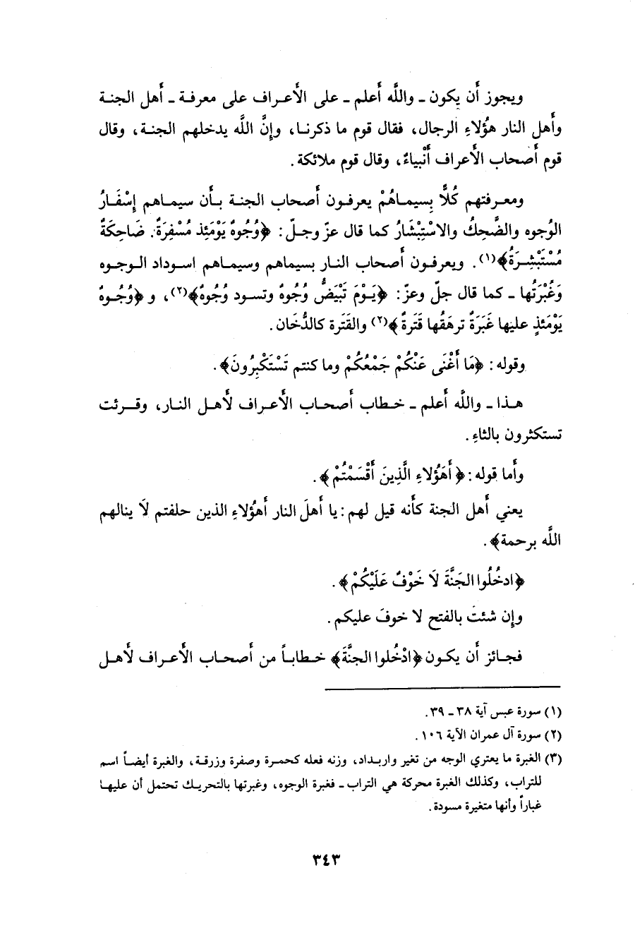 وأهل النار هُؤلاءِ الرجال، فقال قوم ما ذكرنا، وإن اللَّه يدخلهم الجنة، وقال قوم أصحاب الأعراف أنبياء وقال قوم ملائكة.