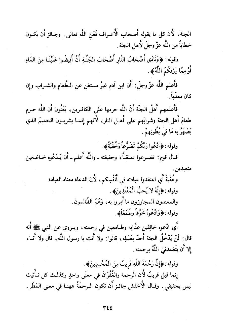أي ادْعوه خائِفين عذَابه وطامعين في رحمته، ويروى عن النبي - صلى الله عليه وسلم - أنه قال: لَنْ يَدْخُلُ الجنة أحدٌ بعَمَلِه، قالوا: ولا أنت يا رسول اللَّه؟ قال ولا أنا إلا أن يتَغمدنيَ اللَّهُ برحمته.