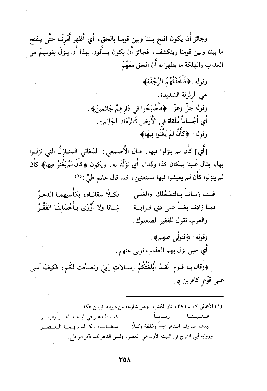 ويكون (كَأَنْ لَمْ يَغْنَوْا فِيهَا). كَأَنْ لَمْ ينزلوا كان لم يعيشوا فيها مستغنين، كما قال حاتم طيٍّ: