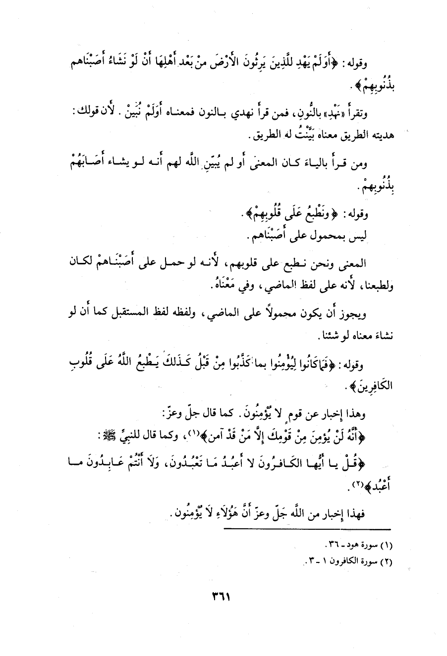 وقوله: (أَوَلَمْ يَهْدِ لِلَّذِينَ يَرِثُونَ الْأَرْضَ مِنْ بَعْدِ أَهْلِهَا أَنْ لَوْ نَشَاءُ أَصَبْنَاهُمْ بِذُنُوبِهِمْ وَنَطْبَعُ عَلَى قُلُوبِهِمْ فَهُمْ لَا يَسْمَعُونَ (100)