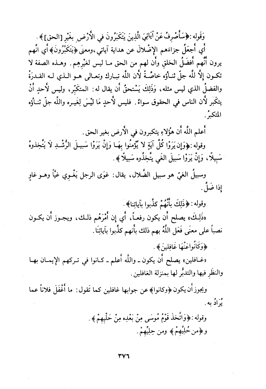 وَقَوله: (سَأَصْرِفُ عَنْ آيَاتِيَ الَّذِينَ يَتَكَبَّرُونَ فِي الْأَرْضِ بِغَيْرِ الْحَقِّ وَإِنْ يَرَوْا كُلَّ آيَةٍ لَا يُؤْمِنُوا بِهَا وَإِنْ يَرَوْا سَبِيلَ الرُّشْدِ لَا يَتَّخِذُوهُ سَبِيلًا وَإِنْ يَرَوْا سَبِيلَ الْغَيِّ يَتَّخِذُوهُ سَبِيلًا ذَلِكَ بِأَنَّهُمْ كَذَّبُوا بِآيَاتِنَا وَكَانُوا عَنْهَا غَافِلِينَ (146)