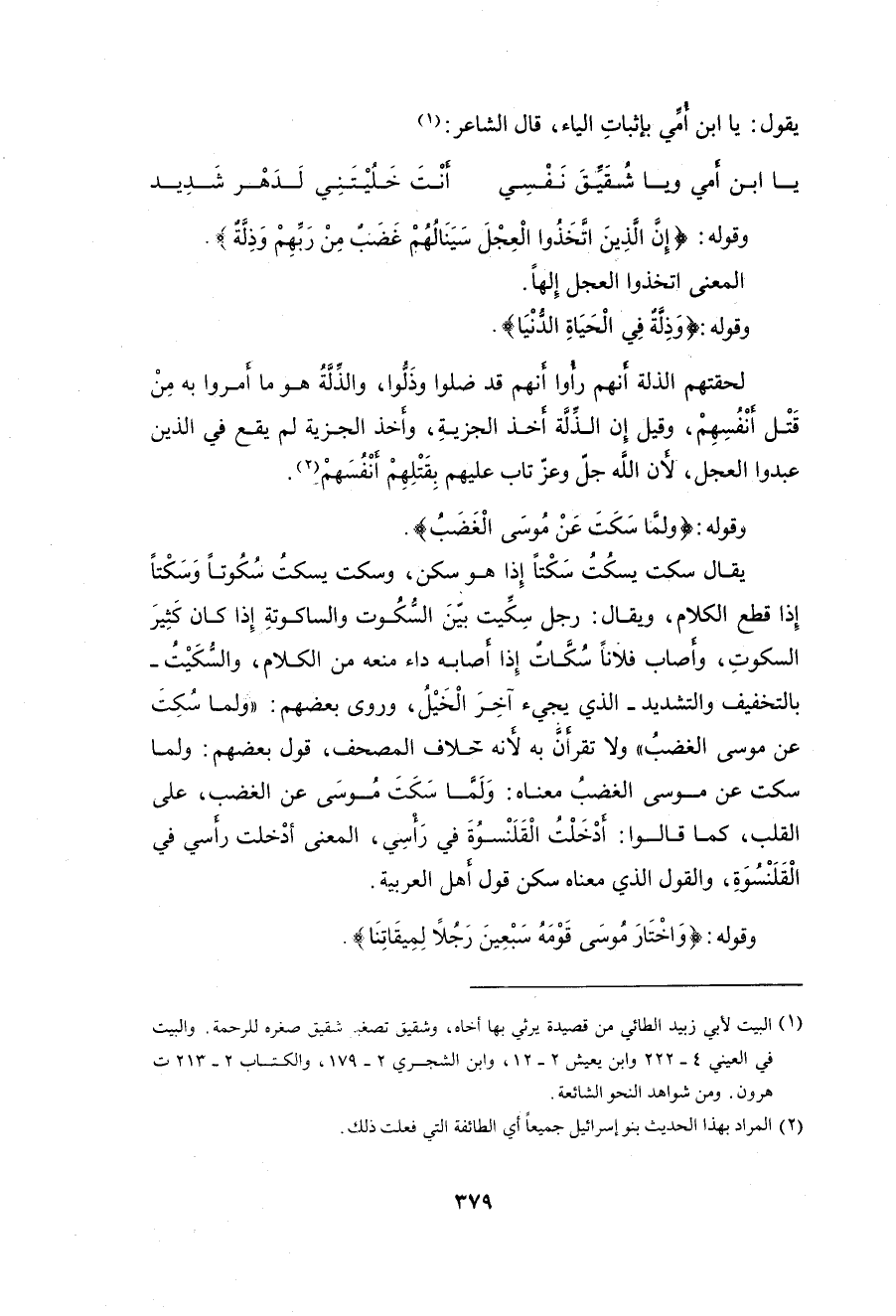 قول بعضهم: (وَلَمَّا سَكَتَ عَنْ مُوسَى الْغَضَبُ) معناه: وَلَمَّا سَكَتَ موسَى عن الغضب، على القلب، كما قالوا: أدخَلْتُ الْقَلَنْسوَّةَ في رَأْسِي.