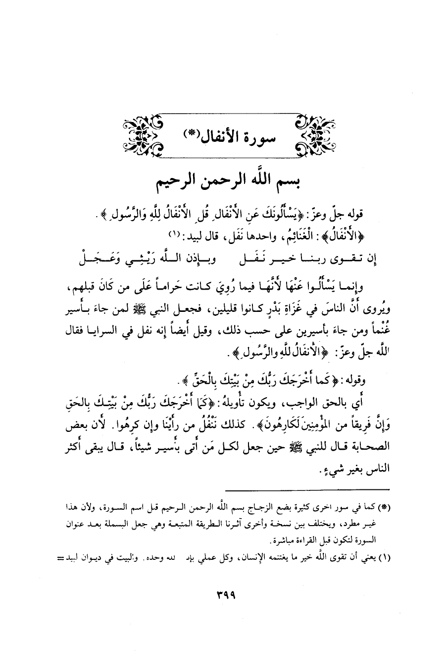 (الأنْفَال) الْغَنَائِم، واحدها نَفَل، قال لبيد: