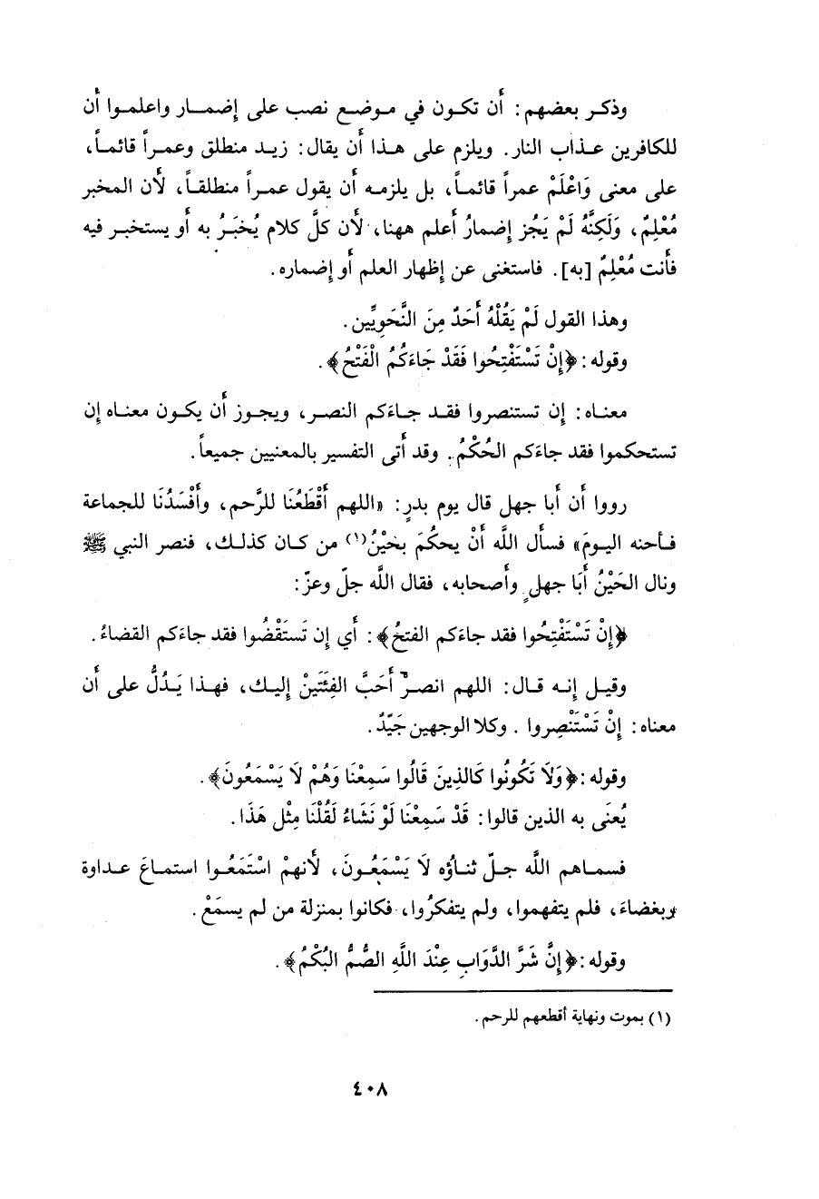 (إِنْ تَسْتَفْتِحُوا فَقَدْ جَاءَكُمُ الْفَتْحُ) أي إِن تَستَقْضُوا فقد جاءَكم القضاءُ.