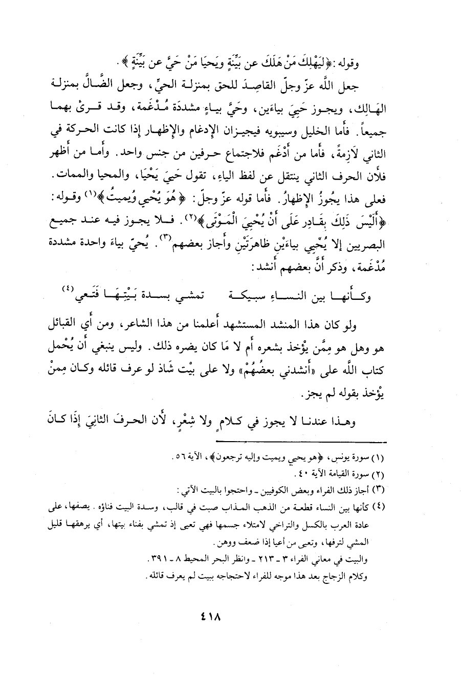 وأمَّا من أظهر فلأن الحرف الثاني ينتقل عن لفظ الياءِ، تقول حَييَ يَحْيَا، والمحيا والممات.