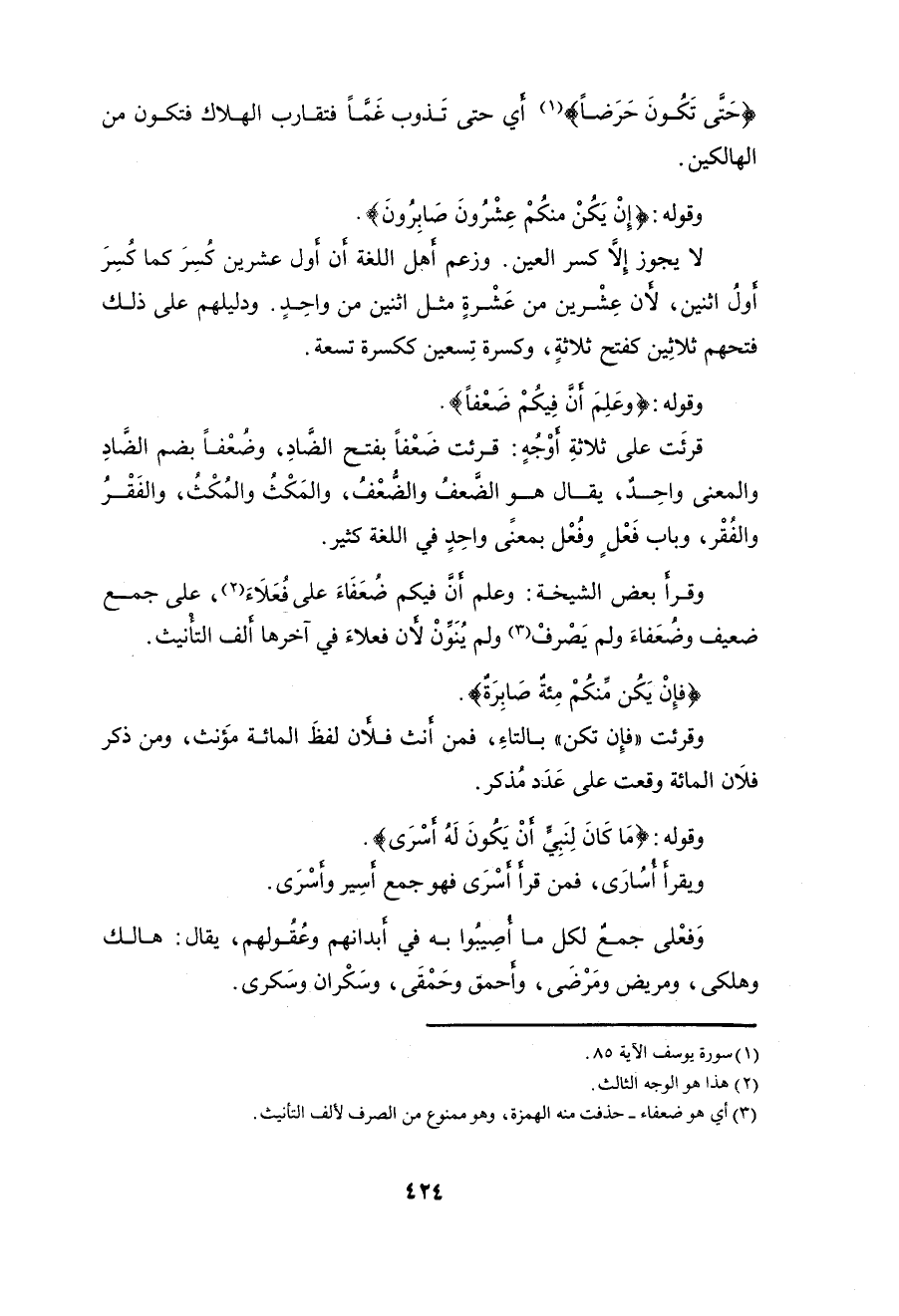 وقرأ بعض الشيخة: وعلم أن فيكم ضُعَفَاءَ على فُعَلَاءَ، على جمع
