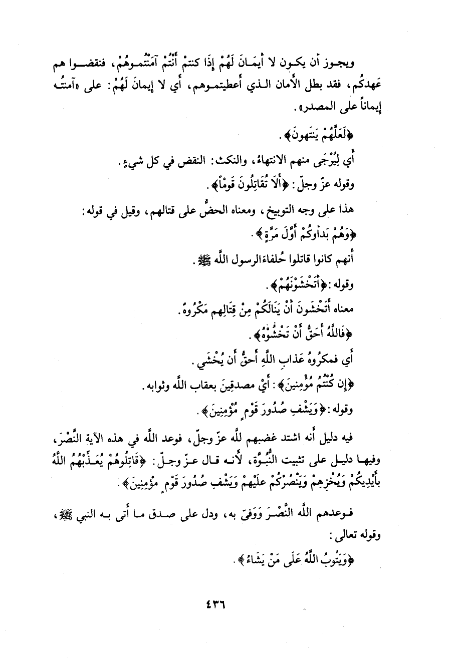 وقوله عزَّ وجلَّ: (أَلَا تُقَاتِلُونَ قَوْمًا نَكَثُوا أَيْمَانَهُمْ وَهَمُّوا بِإِخْرَاجِ الرَّسُولِ وَهُمْ بَدَءُوكُمْ أَوَّلَ مَرَّةٍ أَتَخْشَوْنَهُمْ فَاللَّهُ أَحَقُّ أَنْ تَخْشَوْهُ إِنْ كُنْتُمْ مُؤْمِنِينَ (13)