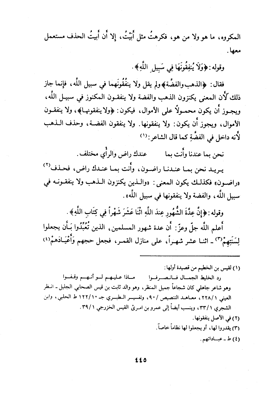 فقال: (الذهب والفضَة) ولم يقل ولا ينفُقُونَهما في سبيل اللَّه، فإِنما جاز